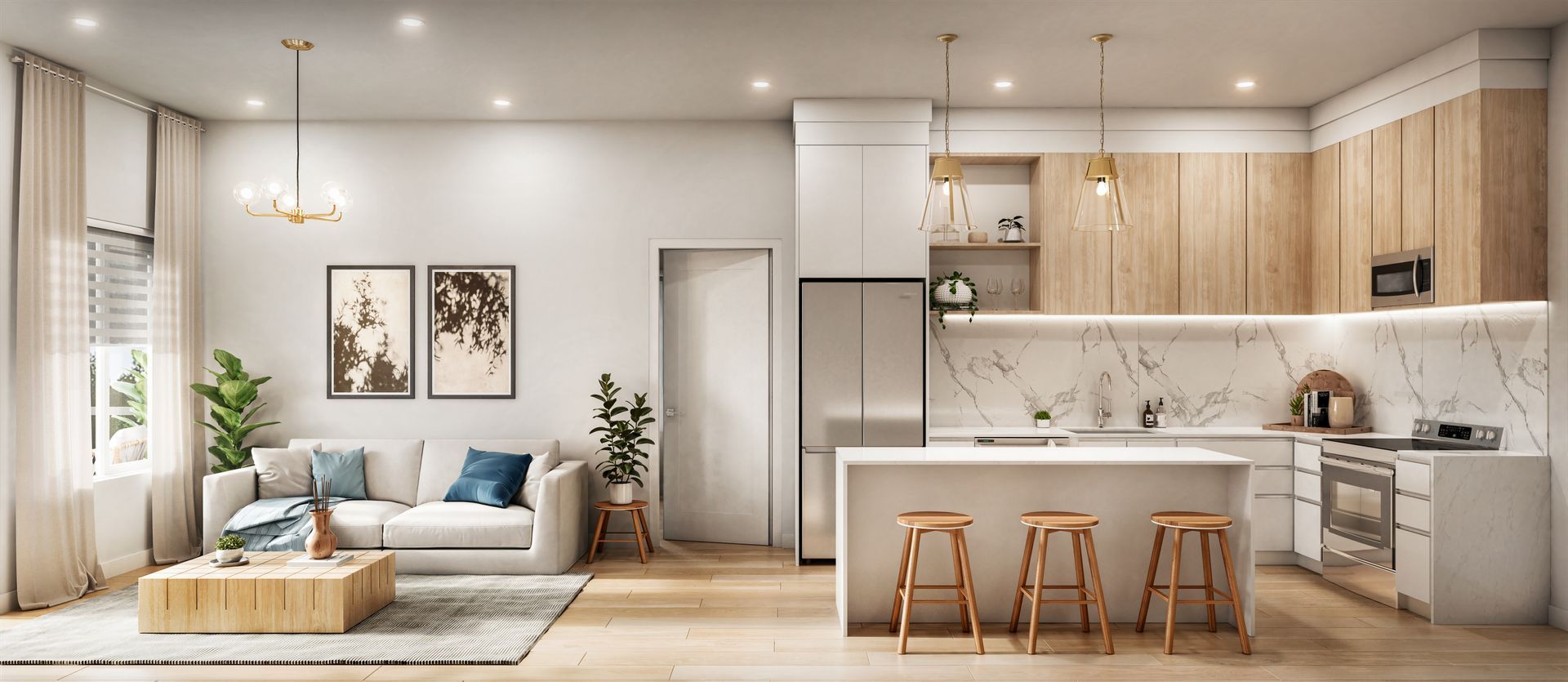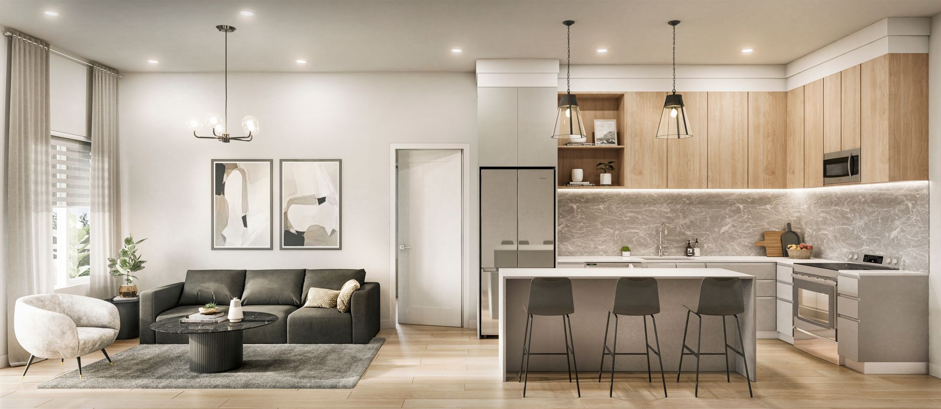 Pinnacle's modern interiors blend style and function, with choices of light or dark color palettes. Homes feature tall ceilings, large windows, and wide plank laminate flooring. Designer kitchens include premium stainless steel appliances and European-inspired cabinetry, while sustainable features enhance comfort and eco-friendliness. At Pinnacle, modern comfort, and timeless beauty combine with high ceilings that invite natural light and open layouts perfect for entertaining. Enjoy year-round comfort with forced air heating and cooling, a well-designed kitchen, spacious bedrooms, and a living space crafted for relaxed living.